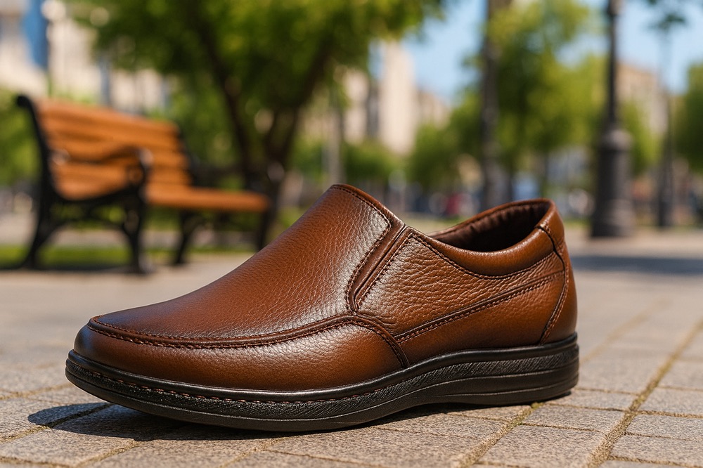 • کفش چرم اصل تبریز با رویه چرم طبیعی، آستر چرم صنعتی، کفی سوئیت پارچه ای و زیره پی یو
