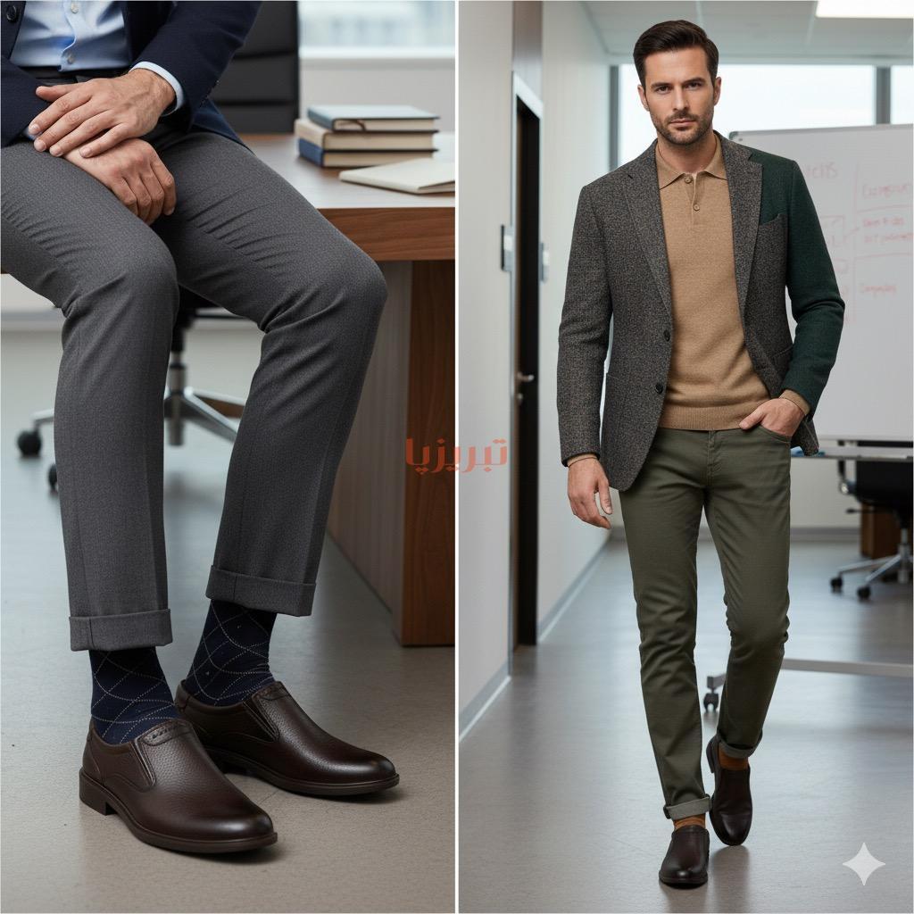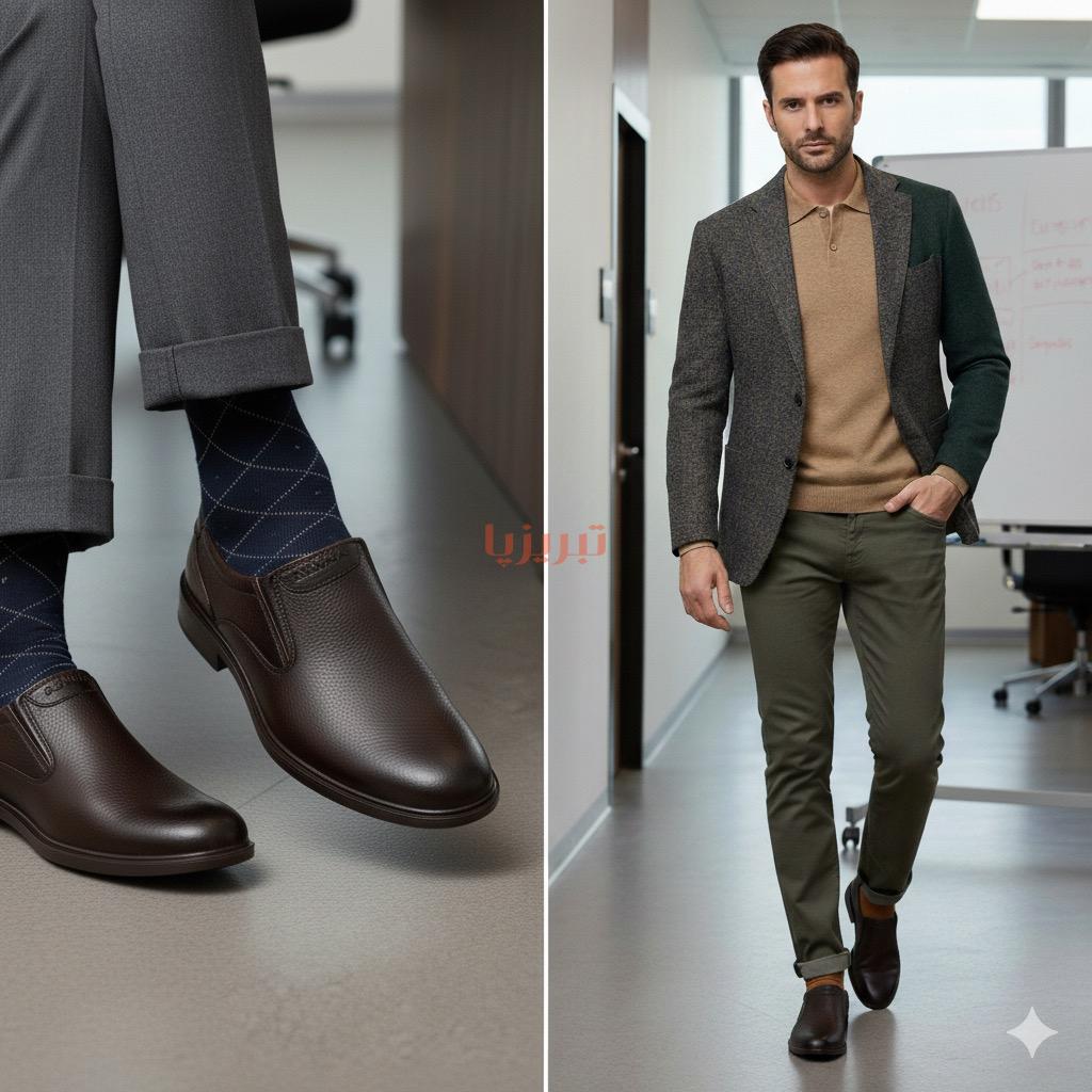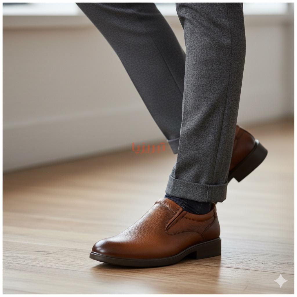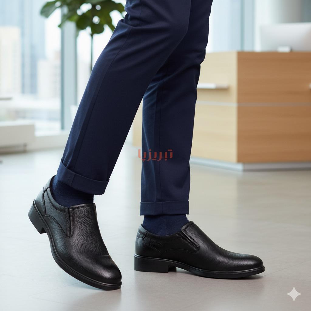 کفش چرم اصل تبریز با رویه چرم طبیعی، آستر چرم طبیعی یا چرم صنعتی، کفی طبی چرم طبیعی یا کفی سوئیت پارچه ای و زیره تزریق
