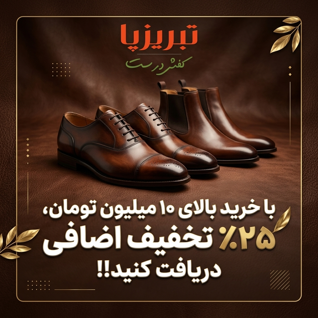 کفش چرم اصل تبریز با رویه چرم طبیعی، آستر چرم طبیعی یا چرم صنعتی، کفی طبی چرم طبیعی یا کفی سوئیت پارچه ای و زیره تزریق